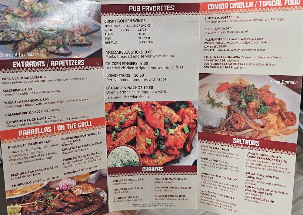 The menu at D'Carbon showcases a variety of Peruvian dishes. Guests can savor appetizers like Papa a la Huancaina. Main dishes include popular selections like Picada D'Carbon and Churrasco. In addition, there are pub favorites like crispy wings and nachos. Desserts round out the experience with sweet choices. Most dishes are reasonably priced, making it accessible for everyone.